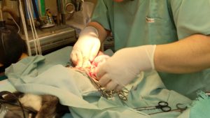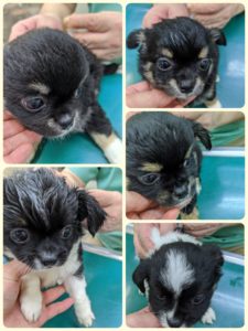 子犬に負担がかからないように軽い麻酔をかけます。徐々に麻酔が効いてくると首がフラフラになります。
