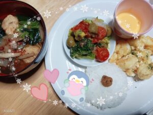 エビとイカのフリッターと具だくさんのお汁物です。ワンズ達と頂きました。(人 •͈ᴗ•͈)ワンズはもちろん、これは食べれません。^^;